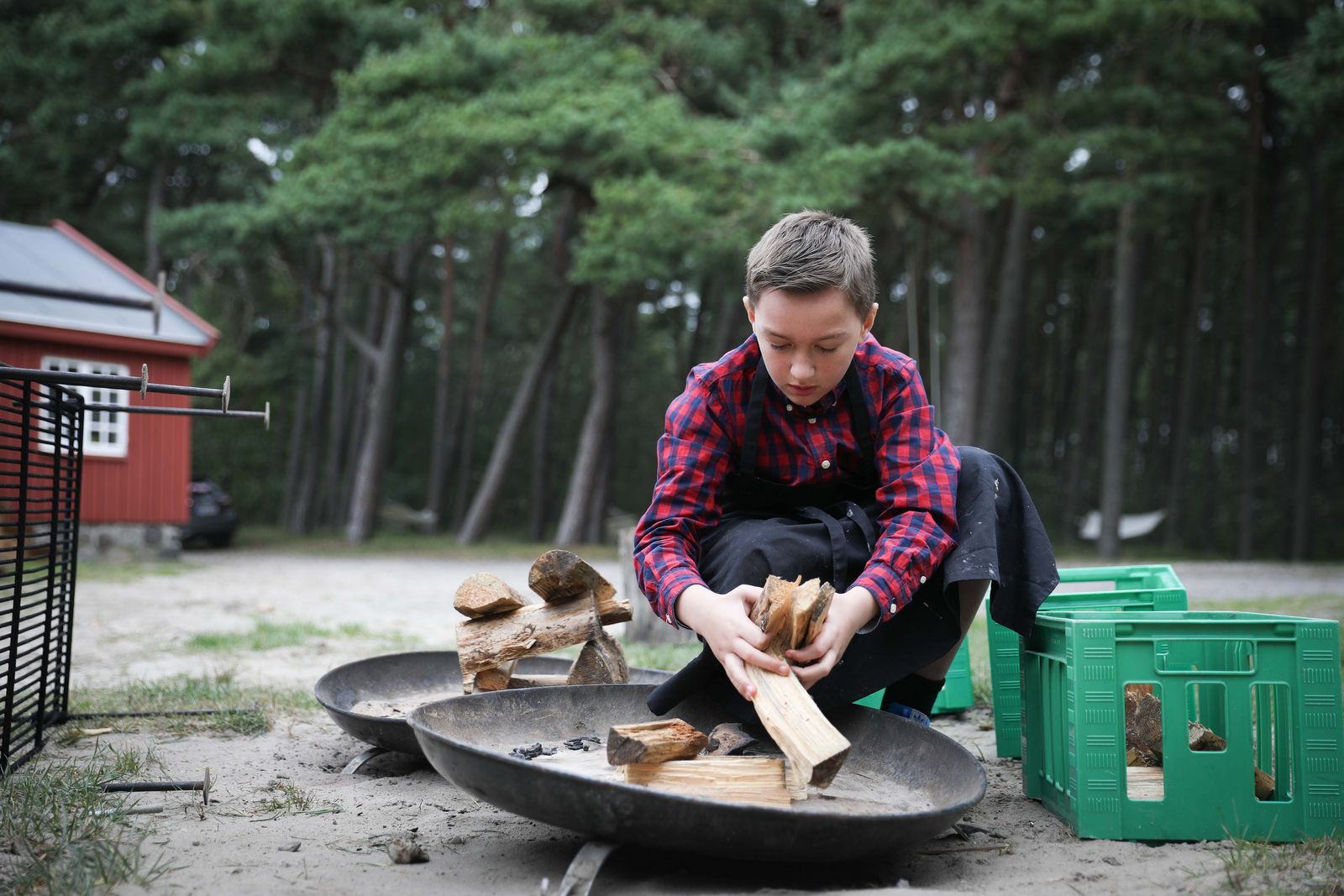 Et økseskaft falder tungt ned over en brændeklods, og træet deler sig i to springende dele, der lander på jorden sammen med de øvrige kløvede stykker. Det er Emre fra Ellebjerg Skole, som håndterer det effektive værktøj, og han har fuldstændigt styr på sikkerhed og metode. Øksen hæves en anelse over hovedhøjde, og inden det store sving går Emre lidt ned i knæ for hurtigt at hæve hele kroppen klar til at hugge. Med præcision får han hurtigt kløvet det brænde, som skal bruges til bålet, når børnene på madkolonien på Egilsholm skal grille makreller, de selv har fileteret. Dagens frokost er under forberedelse.