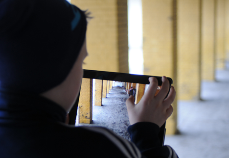 Hos ’Fortællinger 2.0’ sad alle med iPad’en i hænderne, for de skulle ud gruppevis og lave film. Der blev skrevet storyboard, og fem piger var på vej op på loftet for at lave gyserfilm midt i al spindelvævet.