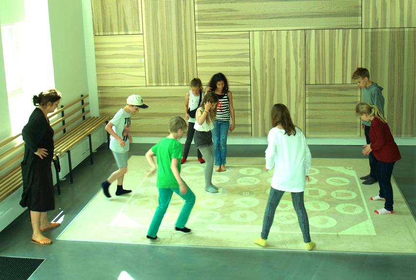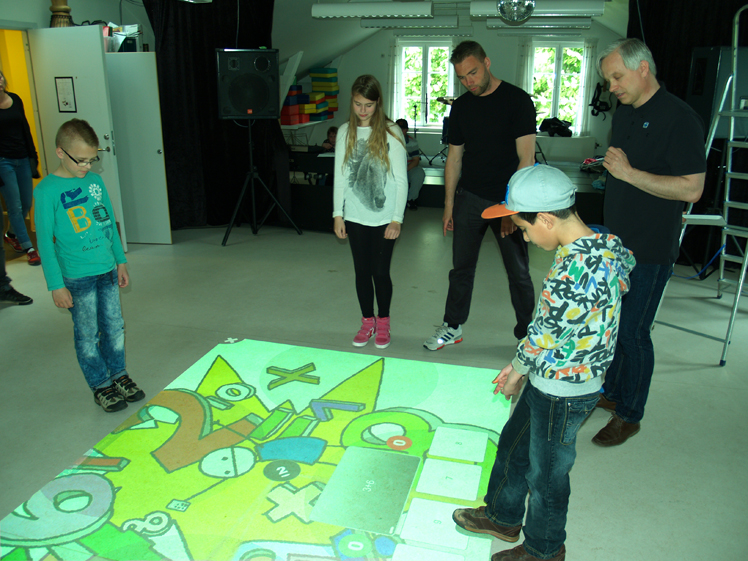 Otte børn i alderen 10-15 år står rundt om det interaktive gulv, parate til at løse de enkle regnestykker, der vises på gulvmenuen. Lidt mere avanceret bliver det, når eleverne skal stave forskellige ord, og der kun er 7 bogstaver til rådighed pr elev på hver af de fire sider.